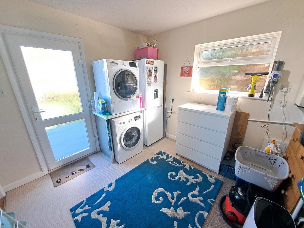 Modern contoured marble effect worktop with plumbing and space for a washing machine under and a tumble dryer above. Space for an upright fridge / freezer. Further appliance spaces. Fitted shelving. Wall mounted Ideal icos gas fired boiler. Ceiling quad spotlight fitting. Radiator. Large opaque UPVC double glazed window to the side. Opaque UPVC double glazed door at the rear leads out to the rear garden. (NB: This room is accessed via bedroom 2 and has enough space to accommodate/create another en suite facility in addition to being the utility room).