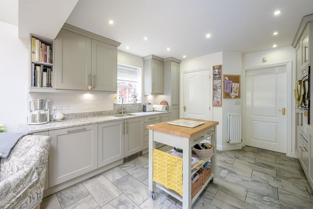 Kitchen/ Breakfast Room - 7.62 x 3.58 (24'11" x 11'8") - With a door from the lower level reception hall, a modern fitted kitchen with a range of wall and base units, marble work surface with matching upstand, in set one and a half bowl sink, integrated oven, microwave and plates warmer, an induction hob with a stainless steel cooker hood over, pull out larder cupboard, integrated dish washer, double glazed windows to the side and rear, double glazed double doors to the side leading to the rear garden, two double glazed Velux windows, portable island, space for a breakfast table, under floor heating and a door to utility.