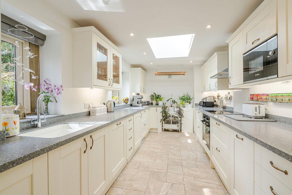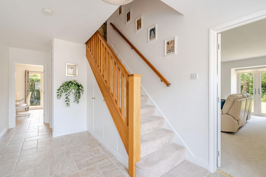 The accommodation extends to around 1,830 sq.ft. arranged over two floors with good ceiling height and room sizes. On the ground floor, there are two generous reception rooms either side of an elegant entrance hall boasting flagstone flooring and the new oak staircase complete with understairs fitted storage. The living room has a Bath stone fireplace for a cosy element while the dual French doors connect to the garden. At the rear, the 28ft kitchen/dining room has been beautifully fitted with well-equipped modern units, integral appliances and recently upgraded with kickboard heaters. French doors off the dining area flow out to a secluded patio terrace ideal for alfresco dining. Off the entrance hall there is a downstairs cloakroom which houses the water softener. On the first floor, there are four double bedrooms, a bathroom with underfloor heating, and an en-suite shower room off the front bedroom. Two of the bedrooms have built-in storage. There is great scope to significantly enlarge the property if desired with an extremely large beamed and floored attic space (844 sq.ft) which could easily be converted into additional accommodation, subject to the necessary planning consents.