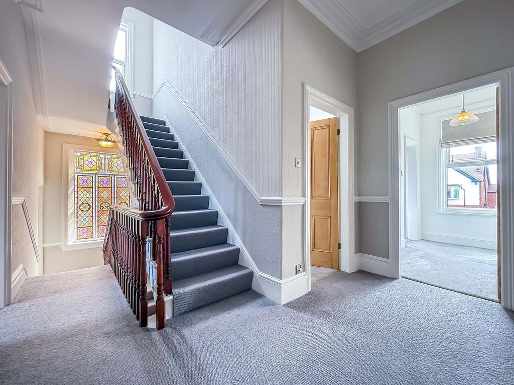Half landing with glazed stained and leaded light window to side, door to family bathroom/ WC and steps up to main landing including dado rail and coving. Separate fixed staircase provides access to second floor with hand rail, spindles and newel post.