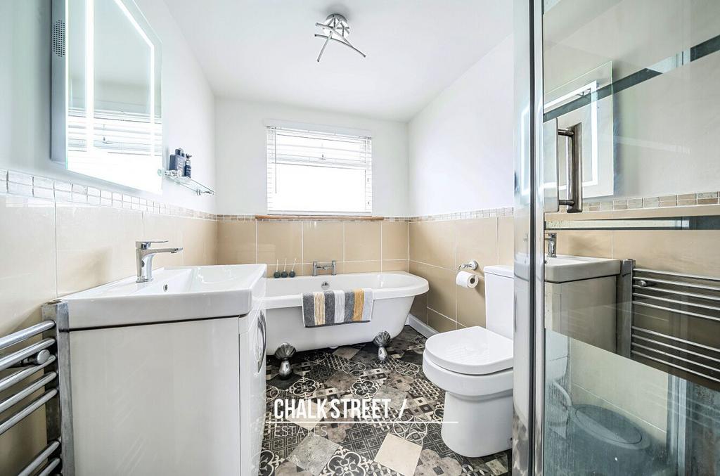 The first floor hosts three additional bedrooms. The principal bedroom measures 16’7 x 9’8 and benefits from built-in storage. The second bedroom is equally spacious at 16’6 in length whilst the third is a single bedroom overlooking the rear garden.