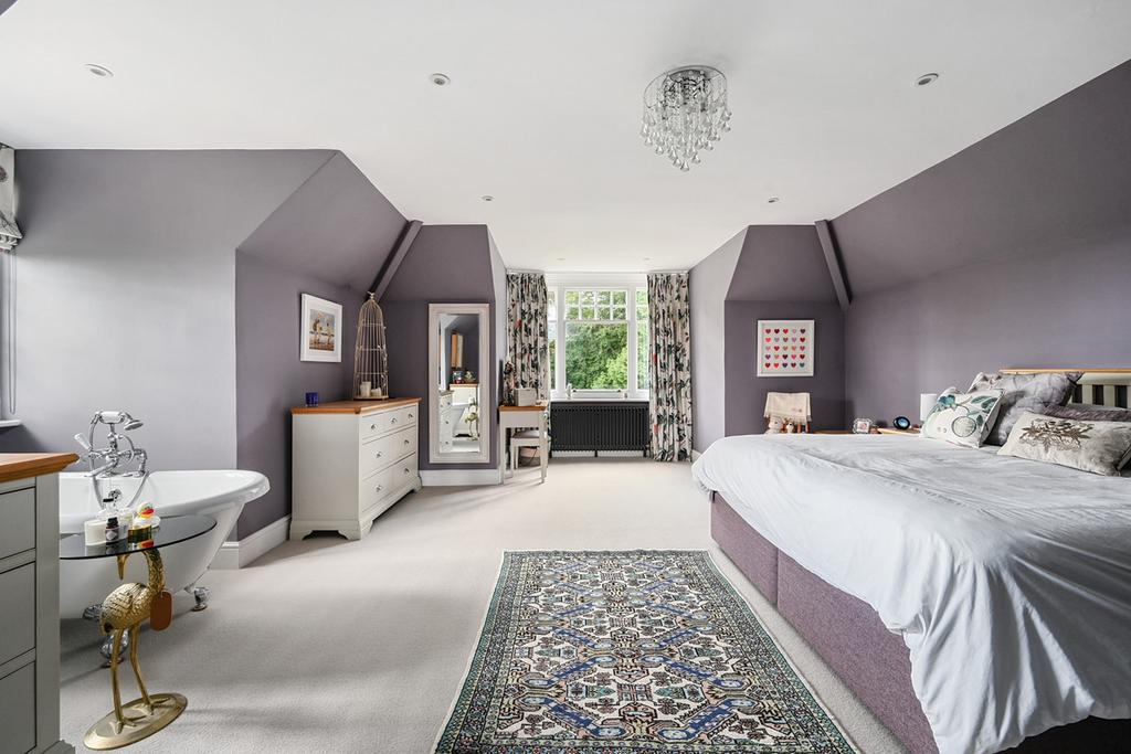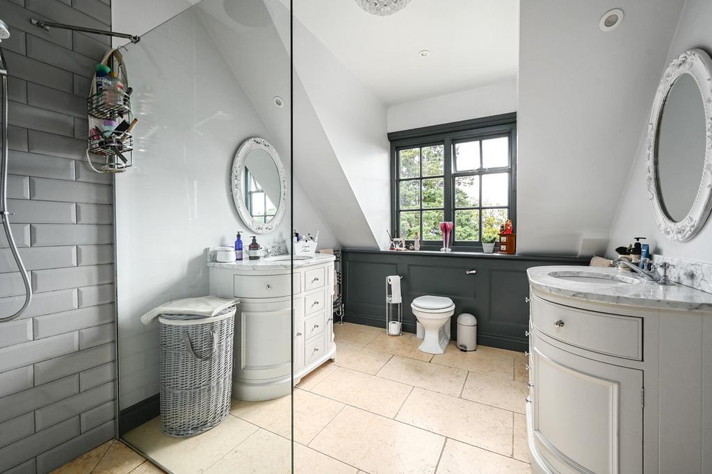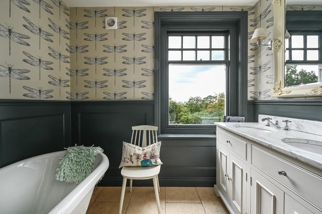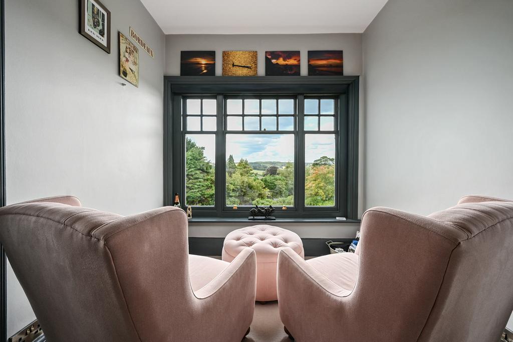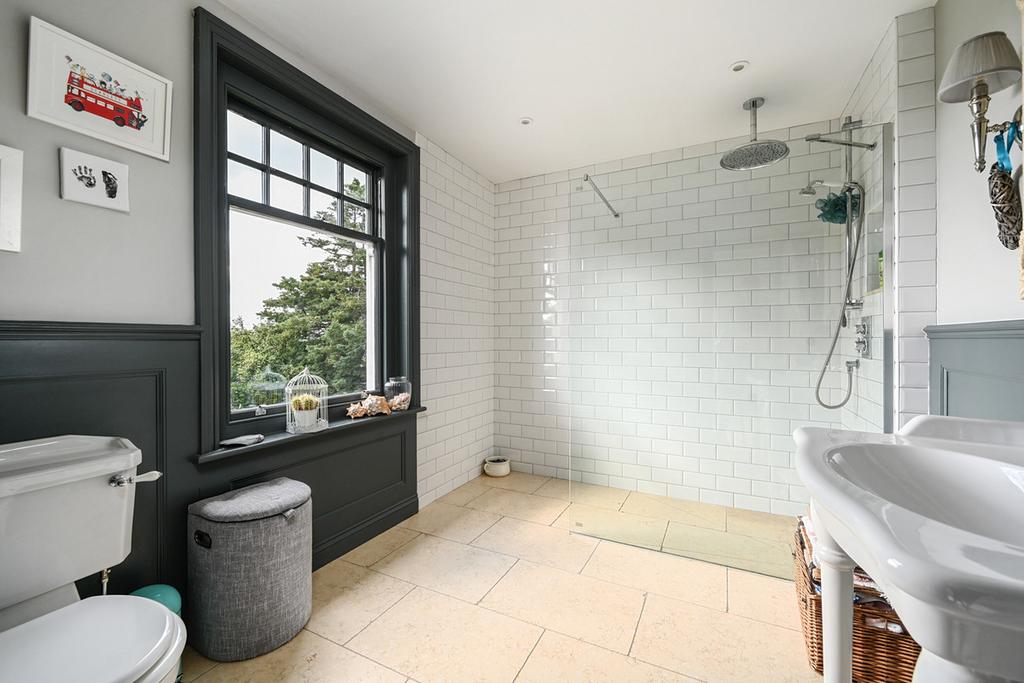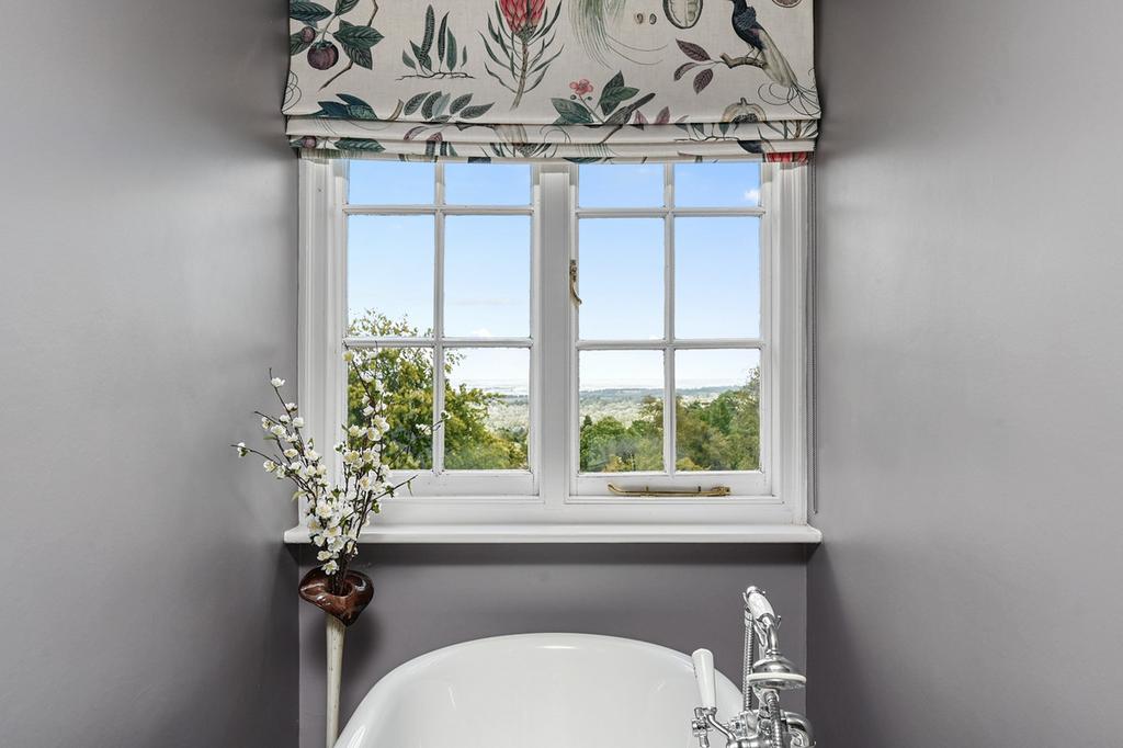 Upstairs, five bedrooms provide extensive accommodation, all with far-reaching views. The principal suite occupies the entire second floor, with a roll-top bath, walk-in wardrobes, dressing room and luxury bathroom. The first-floor bedrooms are equally well-presented and are served by two well fitted bath/shower rooms. One includes a glass-framed walk-in shower, while the other features a freestanding bath. The first floor is completed with a separate WC.