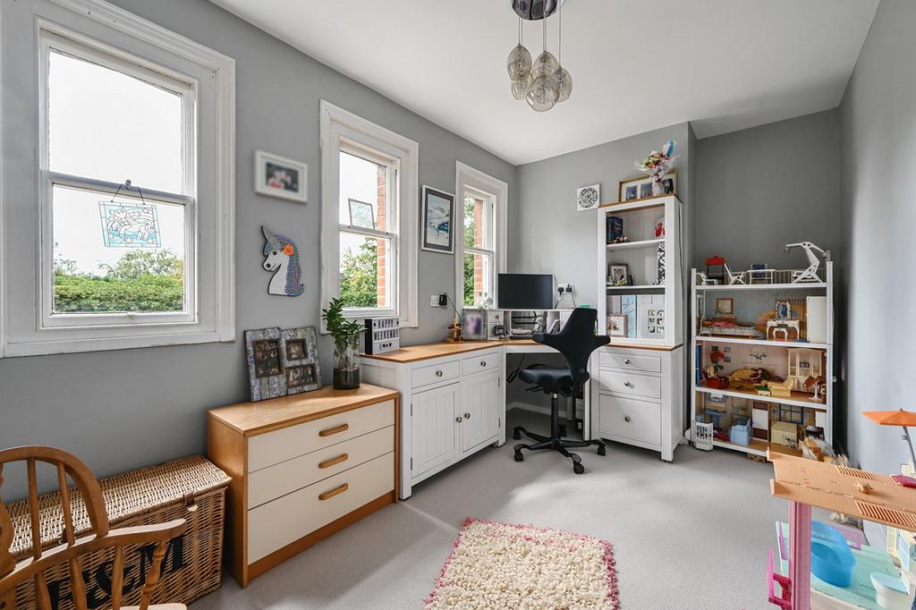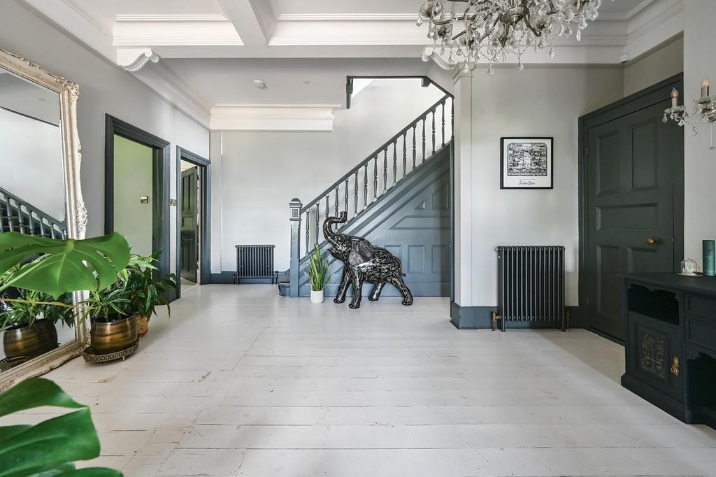 The front door opens into the first of four reception rooms. Filled with light from painted sash bay windows, the double-aspect drawing room is finished to an excellent standard. Period cornicing emphasises the high ceiling, while a stunning wood burner forms the focal point. A demi-glazed door leads to the front veranda. The formal dining room features bay windows and access to a second veranda overlooking the rear garden. A study area leads straight through to the family room, which connects directly to the kitchen, creating a natural flow. The newly fitted kitchen is styled with Shaker cabinetry, a white wood floor, quartz worktops, a walk-in pantry and utility room. A large central island defines the space, while a study, cloakroom, boot room and cellar complete the ground floor of this Edwardian home.