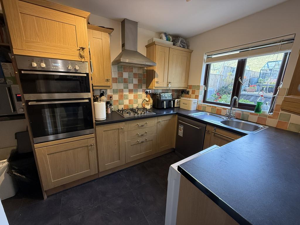 Base and wall units, tall unit incorporating electric double oven. 4 ring gas hob with stainless steel effect extractor hood over, double glazed window to rear, Single bowl and drainer sink unit with mixer taps over, plumbing for washing machine tiled splashbacks, understairs storage cupboard and glass panelled door through to: