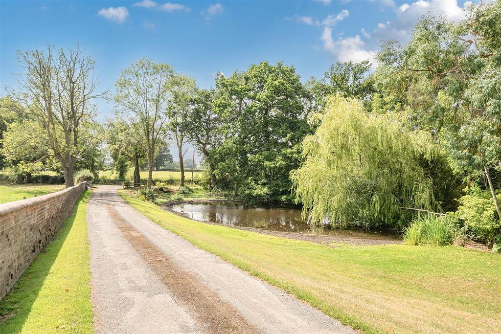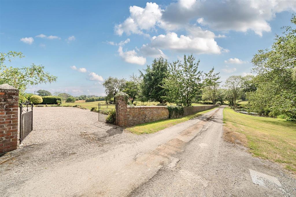 Outside - The farmhouse is complemented by a large garden with a decoratively stoned parking area, lawns with shrub borders and mature/semi-mature trees, brick paved paths and brick wall, beech hedge and estate fencing boundaries.
