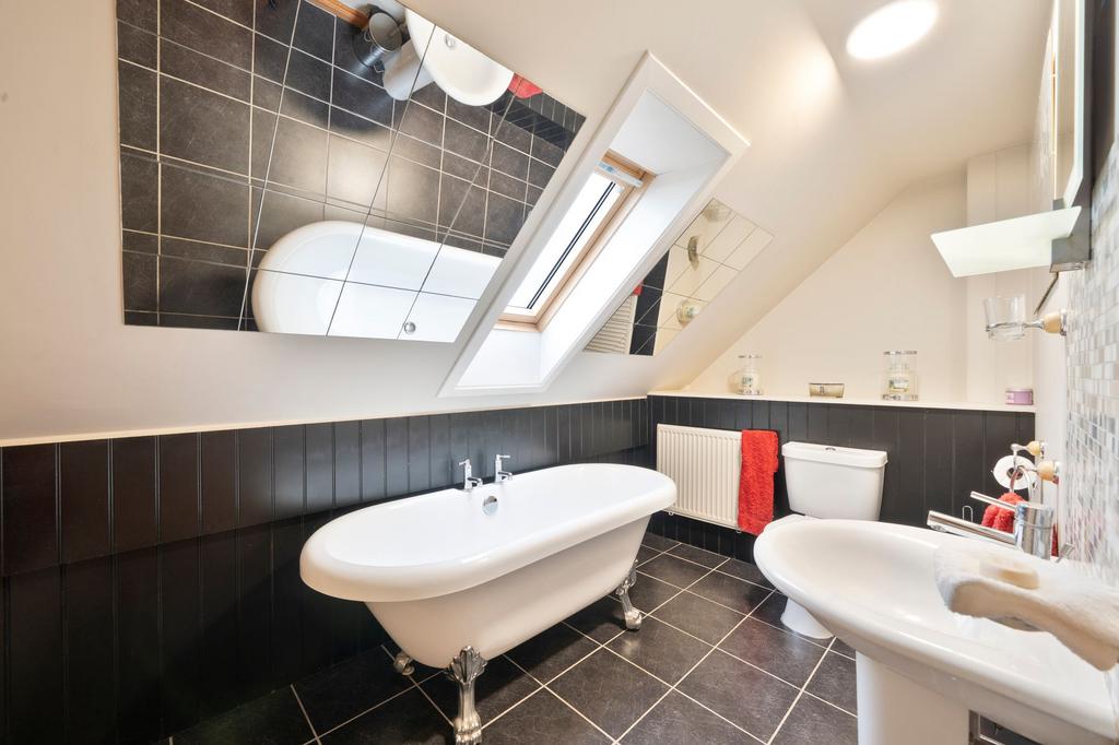 The second floor is a rare and highly desirable feature, offering exceptional additional living space not often found in properties of this type. A generously sized landing leads to two large double bedrooms, each with sloped ceilings and skylights that provide excellent natural light and character and a bathroom with a stunning free standing roll top bathtub.