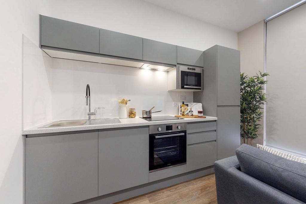 The apartment features a sleek open-plan kitchen and living area, complete with high-spec appliances, a smart TV, comfy sofas, and a washer-dryer for added convenience. The separate double bedroom includes generous under-bed storage drawers, a study desk with an office chair, and a luxurious en-suite bathroom fitted with a heated towel rail.