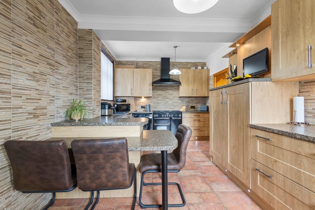 5.43m x 3.03m (17' 10" x 9' 11") Superb dining sized kitchen complete with stylish wall and base units providing ample storage with complimentary work surface, plumbing and space for a range style cooker, integrated fridge freezer and dish washer, plumbing and space for a washing machine, composite sink and drainer, modern tiled finish, breakfast bar seating area, tiled flooring and double glazed window to the side and rear.