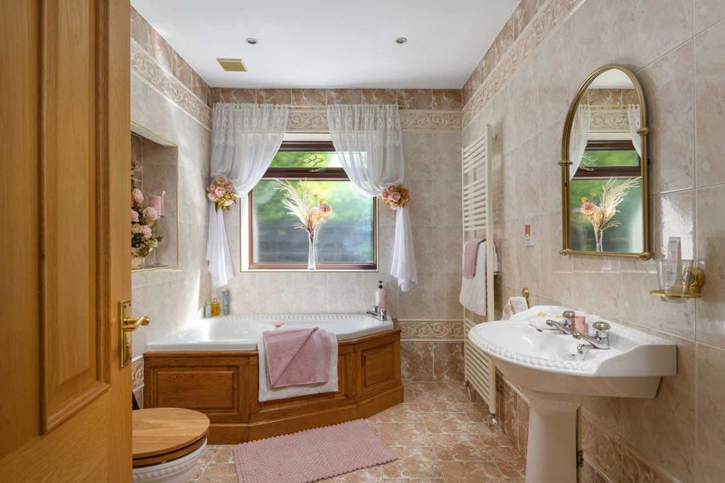 The bedroom accommodation lies on the opposite side of the entrance hall from the main living spaces, ensuring privacy and quiet. The newly renovated principal bedroom suite offers a private retreat with bespoke fitted furniture and a contemporary finish. A freestanding bathtub is positioned to take in views through floor-to-ceiling glazed doors that open directly to the garden, allowing natural light to flood the space. The en-suite is equally impressive, featuring a walk-in shower with frameless glass, high-quality fixtures, underfloor heating, and a calm, spa-like atmosphere. Two further bedrooms sit within this wing, one with its own en-suite, alongside a well-appointed family bathroom.