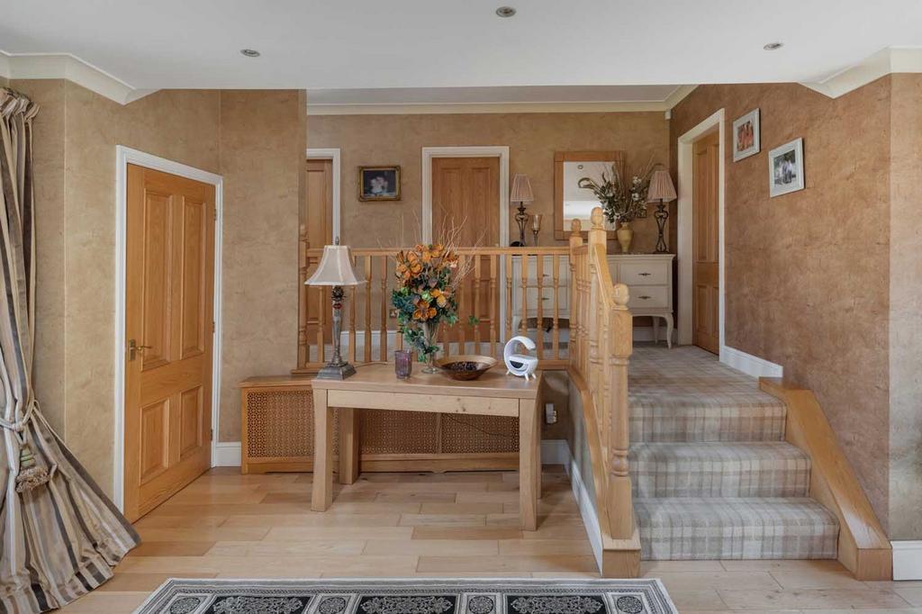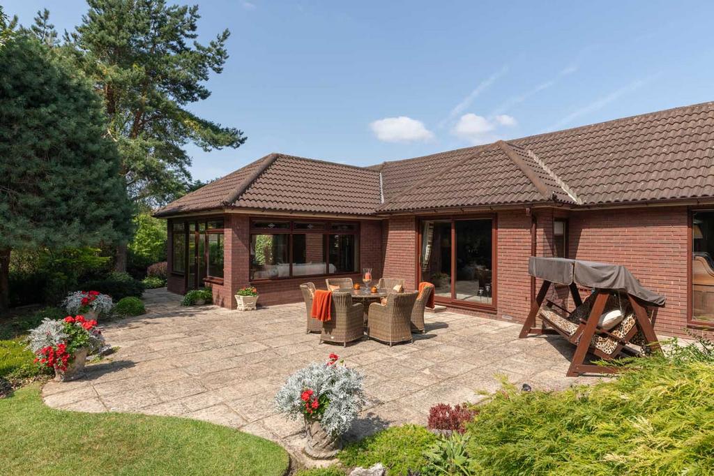 Set within an exclusive development, this detached single-storey home occupies a magnificent plot where landscaped gardens and mature planting create a private and picturesque setting. Approached via a sweeping drive with generous parking and a triple garage, the property immediately conveys a sense of arrival. Inside, large windows and glazed doors frame garden views at every turn, filling the interiors with light and connecting each room to its surroundings. The result is a bright, welcoming home of impressive scale with an easy flow into the surrounding gardens.