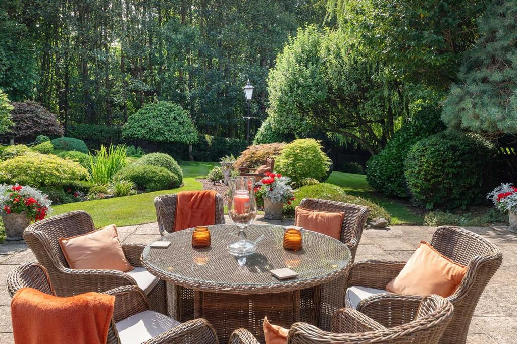 The gardens are a defining feature of the property, carefully landscaped to offer both beauty and variety throughout the seasons. A natural-style pond with cascading waterfalls forms a tranquil focal point, edged with smooth stones and lush aquatic planting. Mature trees, flowering shrubs, and thoughtfully positioned borders create layers of colour and texture, while clipped lawns and curved pathways guide you through the grounds.