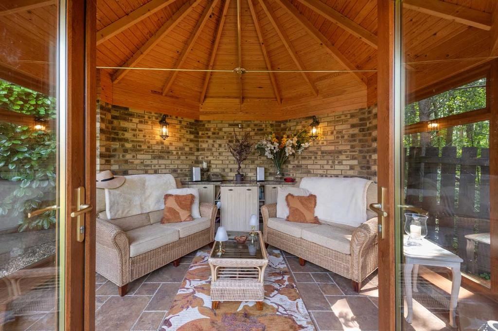 Several terraces provide options for outdoor dining or quiet relaxation, from sunlit spaces beside the house to shaded nooks tucked amongst the planting. The summer house is a highlight — equipped with power and a fridge, it is designed as a comfortable retreat and offers scope for use as a garden office, studio, or an inviting space for entertaining. Positioned to enjoy views across the garden, it includes seating areas both inside and out, making it equally enjoyable in all seasons.