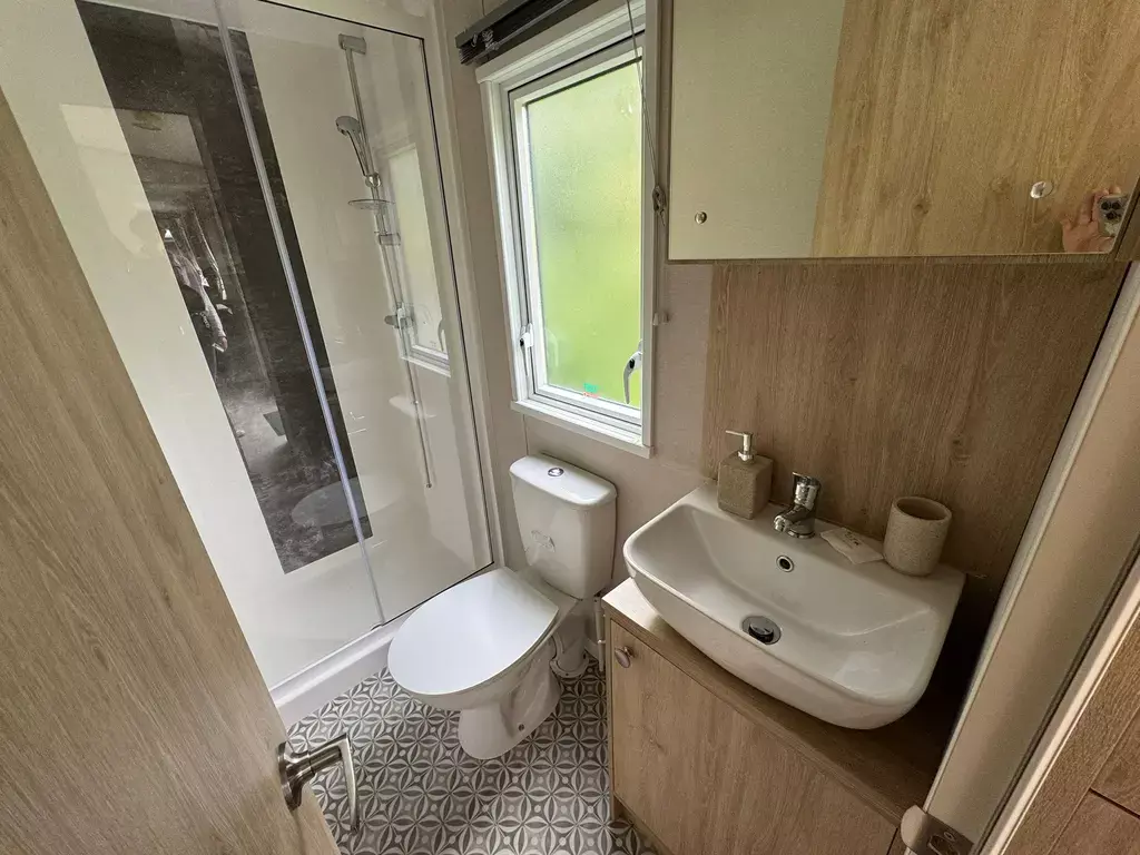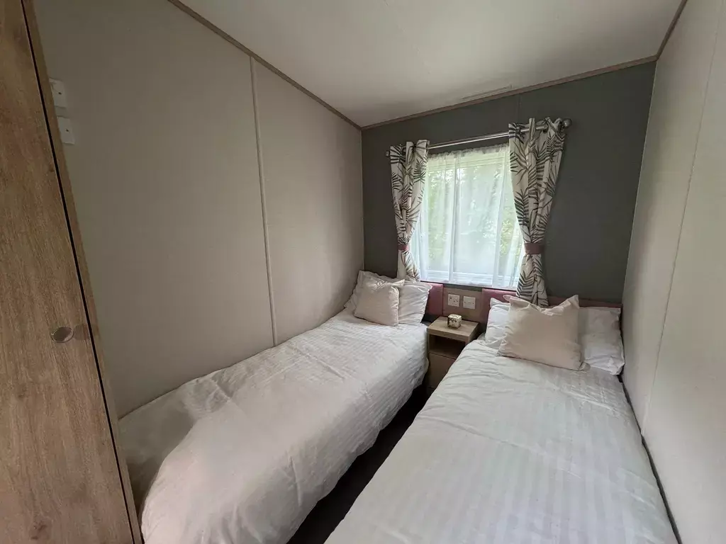 Oozing style and modern decor throughout. Spacious open plan lounge and kitchen area create a very light and airy living space.The lounge comprises of a large freestanding three seater sofa incorporating pull out bed for those extra guests, further two seater sofa plus armchair. There is a contemporary electric fire with TV wall storage unit and coffee table including footstool. Leading to a stunning fully fitted kitchen with integrated appliances including fridge freezer, gas cooker and hob with stainless steel extractor fan. There are an abundance of storage cupboards and a family size dining table for those evening meals together.Hallway leads to vestibule with practical cloaks area. Master bedroom is a real eye pleaser with double bed, wardrobe and large dressing area plus ensuite shower room. The good sized twin room has wardrobe and vanity unit.Finance available subject to status.