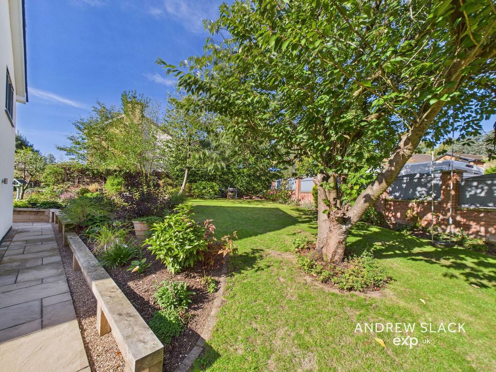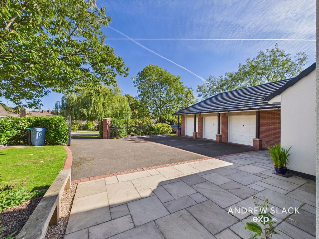 The rear garden is fully enclosed and attractively landscaped with a mix of lawn, mature planting and patio areas—perfect for summer gatherings. To the front, the secure gated entrance leads to extensive parking and three integral garages, making it ideal for a busy family lifestyle.