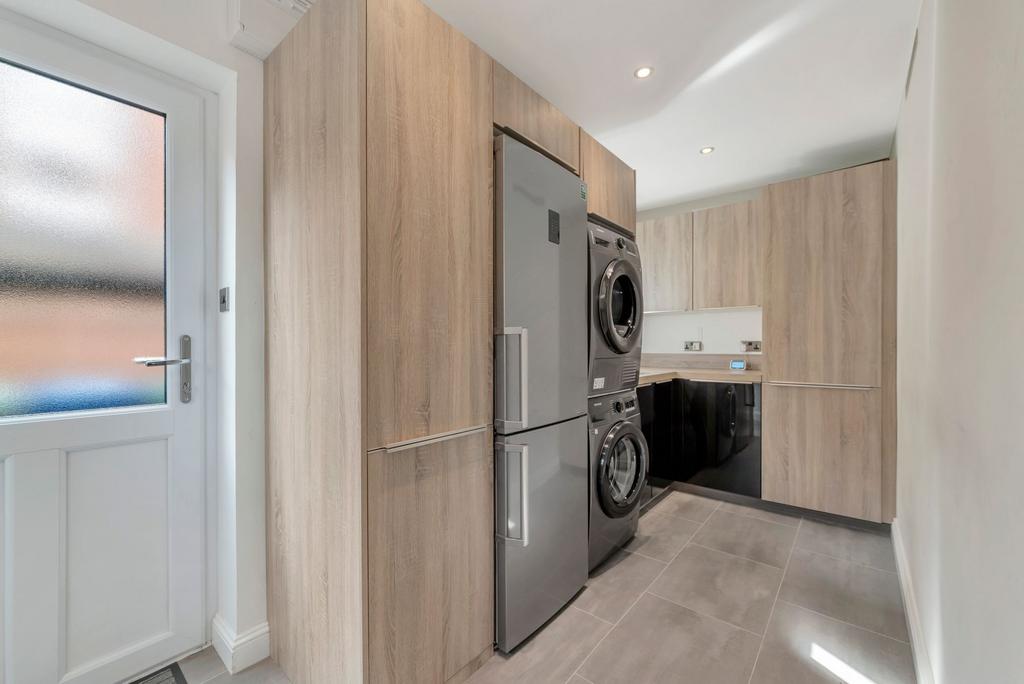 - A generous utility room with fitted storage in keeping with the kitchen design, offering space for appliances and direct access to the side of the property