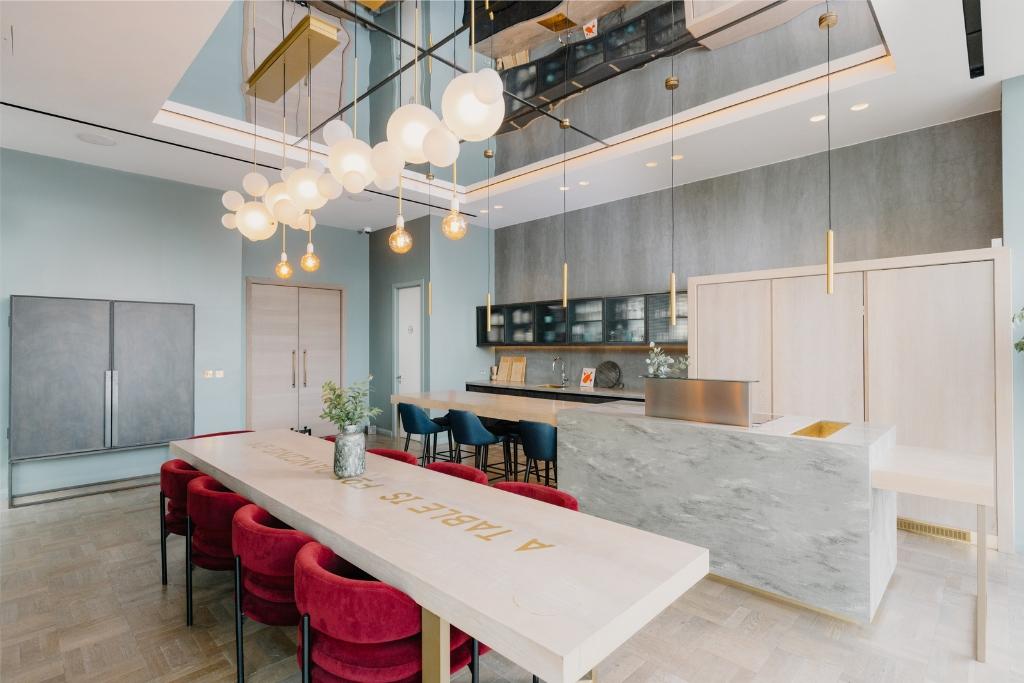 Open plan, sleek and modern with quartz worktops and integrated Samsung appliances including touch control ceramic induction hob, dual fan oven, microwave, separate stacked fridge and freezer, dishwasher plus washer/dryer. Room to entertain with marble effect dining table and four chairs.