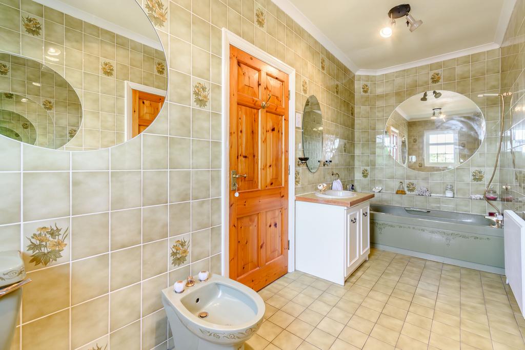 Suit comprising panelled bath, hand basin with cupboard under, WC, bidet, radiator, fully tiles walls. Connecting door to;