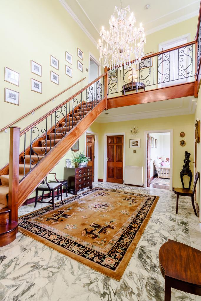 A most impressive double height room. Marble floor, 2 radiators, 2 wall light points, moulded cornice. Door to coats cupboard and