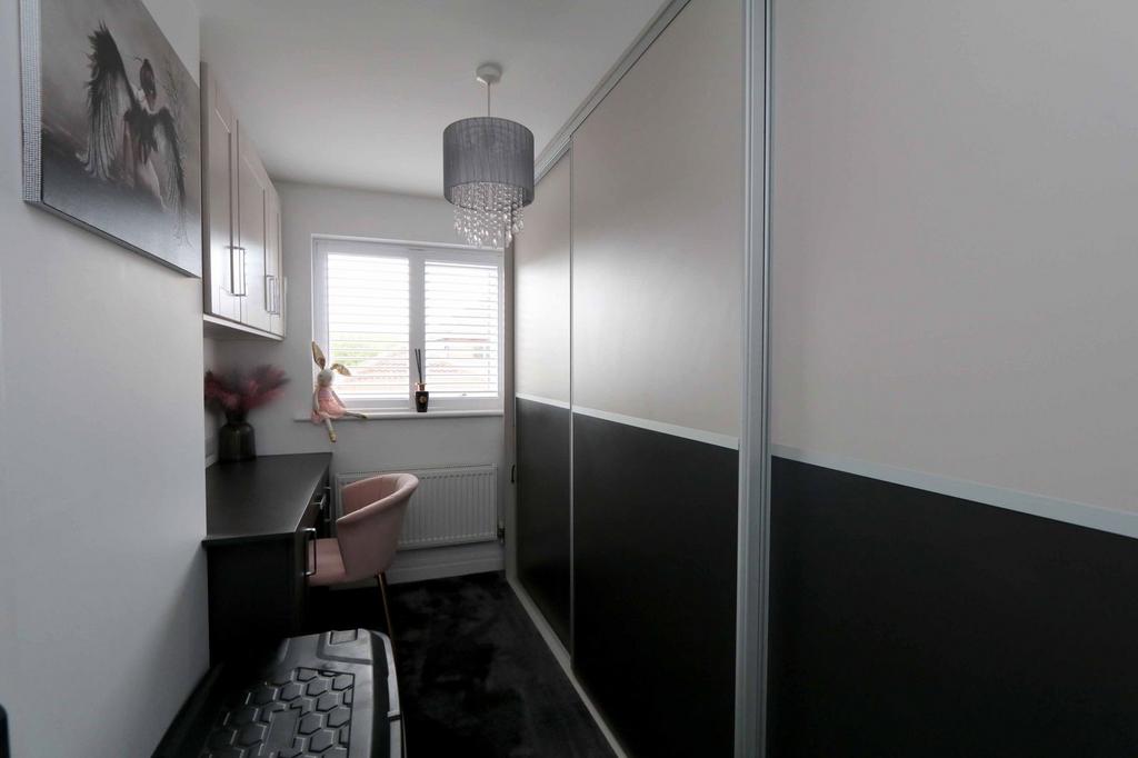 Currently used by the present owners as a dressing room with a built in desk/ dressing table with cupboards to side and above and built in wardrobes with sliding door to the length of one wall. Upvc double glazed window with plantation shutters.
