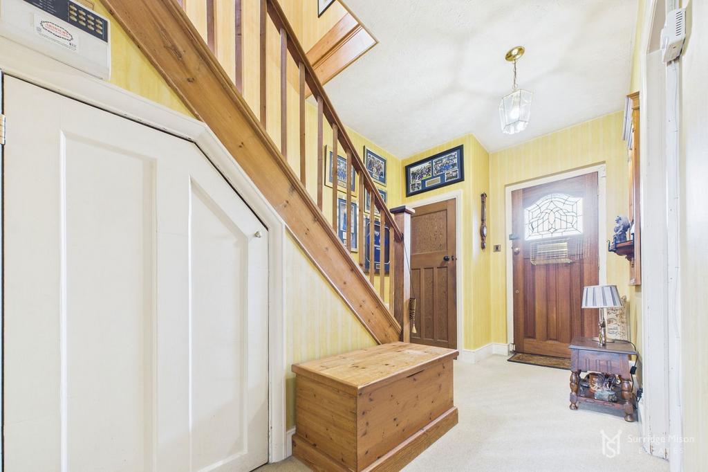 Wooden door to front with glazed panel. Two radiators. Carpeted. Stairs leading to first floor with built in storage cupboard under.