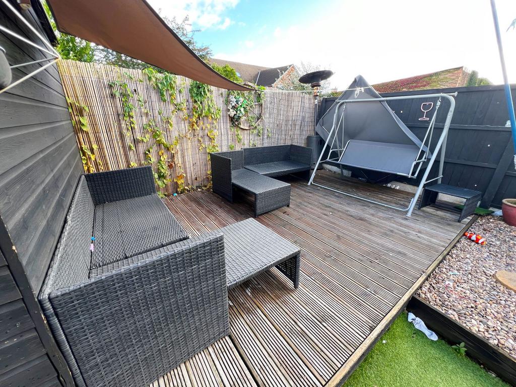 Outside, to the rear, is a slabbed patio that leads to a lawn area, decking, and a shed with wood panel fencing surrounding it.
