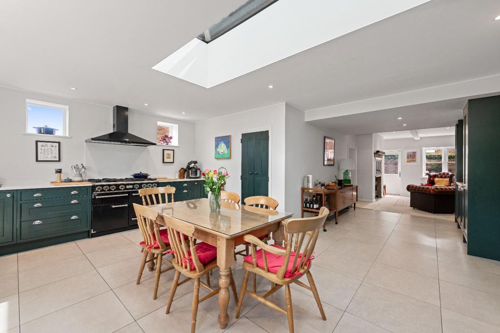 - The open-plan kitchen/diner, with stone surfaces, roof lantern, and walk-in pantry, is ideal for both everyday living and entertaining