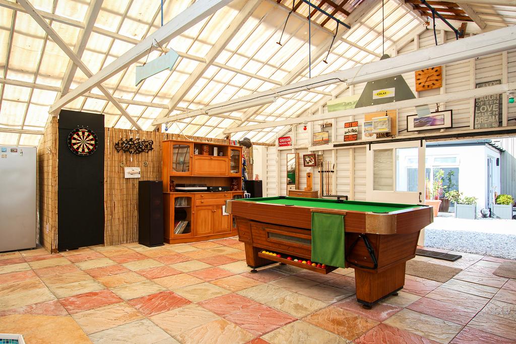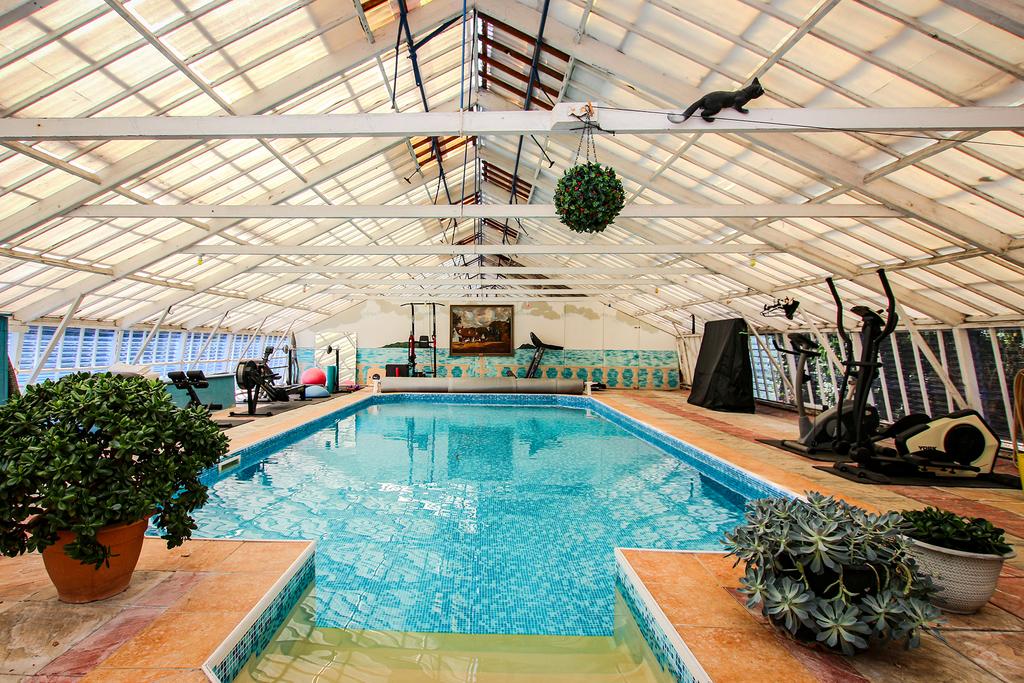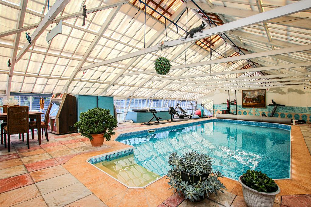 Externally there is ample parking plus a garage with storage space above. The well stocked mature gardens are a real highlight with multiple greenhouses and sheds, spa and pond. To one side is a large timber green house, part of which is utilised as storage space and the other section houses a swimming pool, games area and gym.