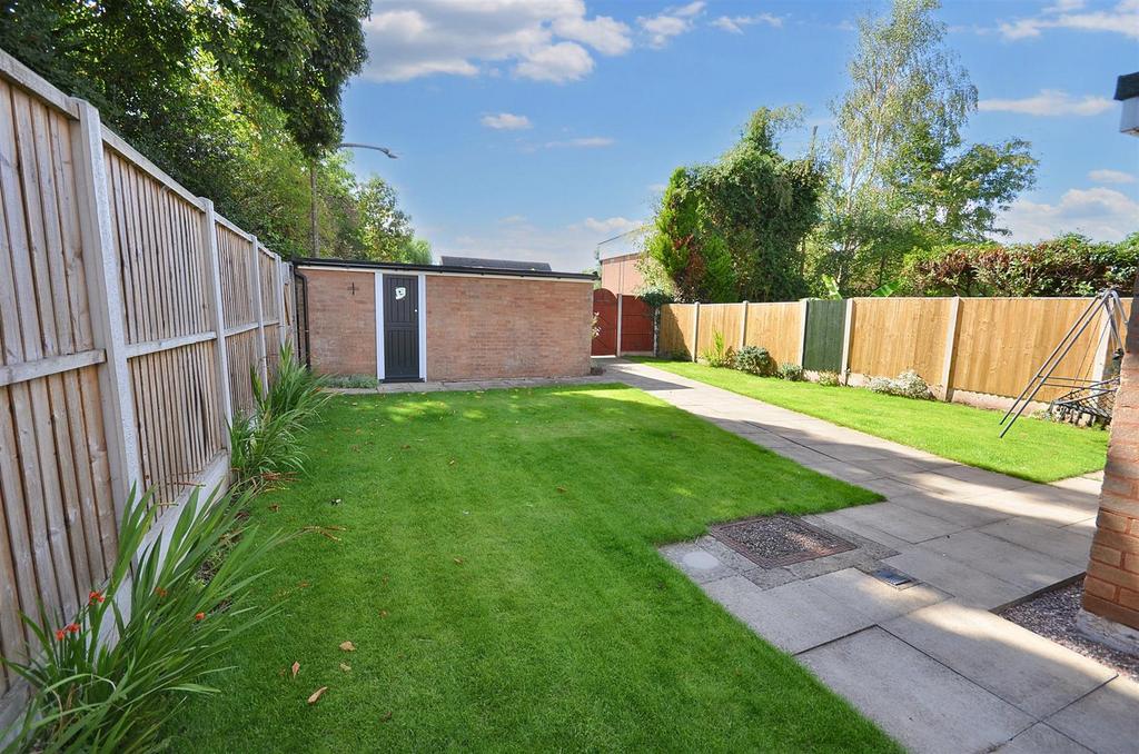 Large established gardens to three sides, mainly lawn with established hedge and fenced borders. Single garage with up and over door, light & power (right hand of the pair with white door).