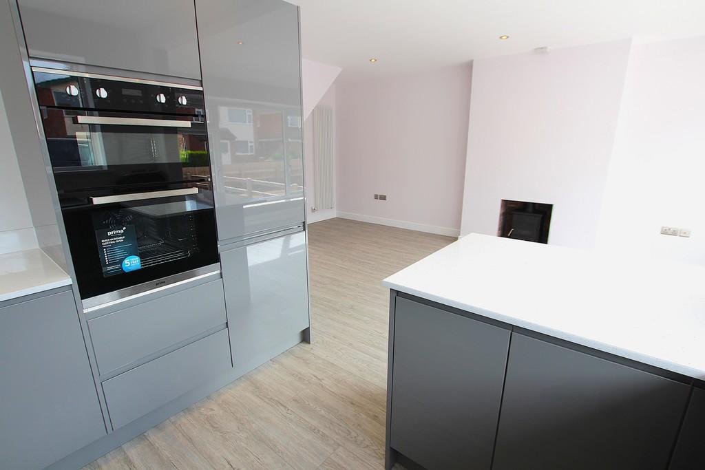 KITCHEN 8' 0" x 7' 11 (max)" (2.44m x 2.41m) Very well fitted with a stylish, high quality range of both base and eye storage level units in a much sought after modern, grey, high gloss finish. The base level units surmounted by white quartz effect worksurfaces with matching upstand. Inset acrylic sink unit with mixer tap. Integrated 60/40 fridge freezer and also a built in four ring gas hob below which is a built in double oven. Plumbing for washing machine. Vertically mounted radiator. TV aerial point. Downlighters inset to ceiling. Double glazed window to the front elevation.