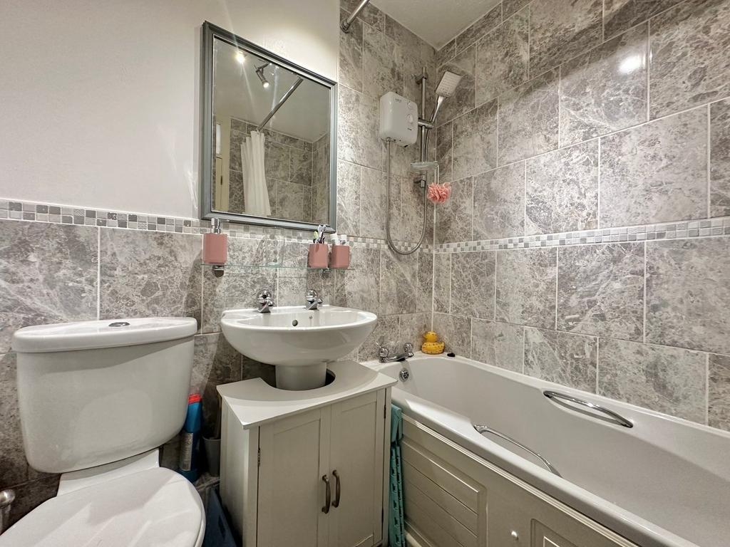 With tiled floor and walls, fully tiled surrounding the bath which has chrome mixer tap over and electric shower over and shower curtain rail, ceiling extractor point, chrome towel radiator, low level WC, wash hand basin with chrome hot and cold tap over, and ceiling light point.