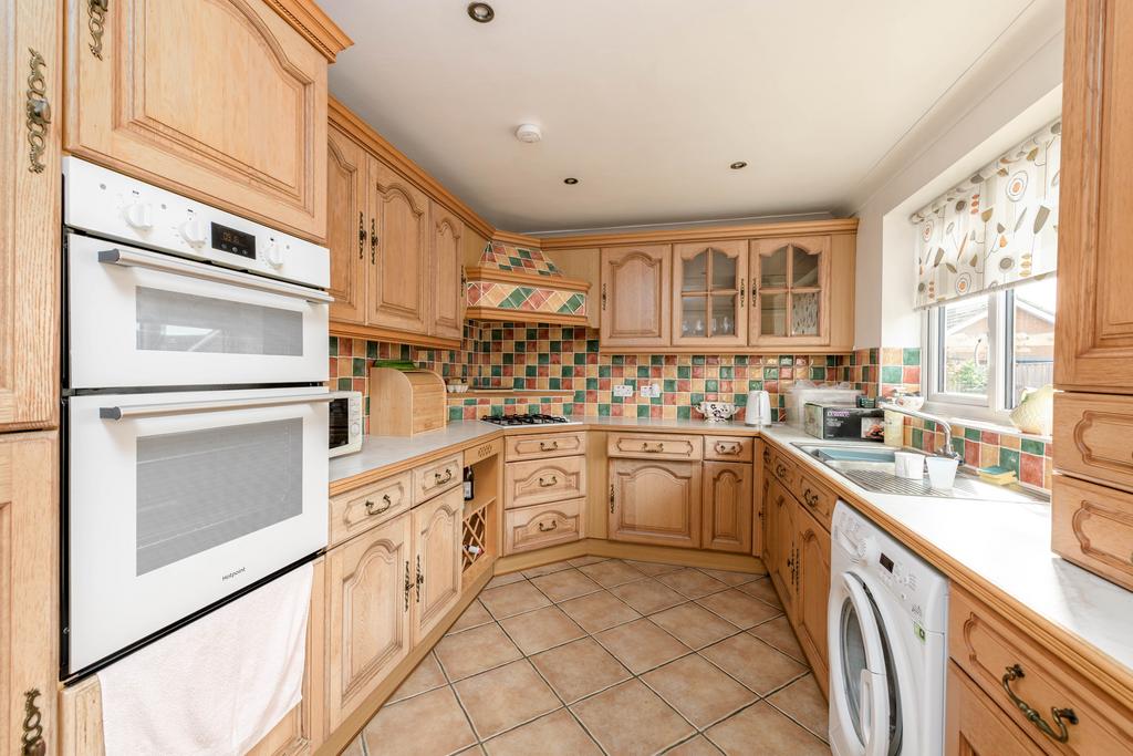 Fitted with a range of base and wall units, wood edged worksurfaces with tiled splashbacks, 1 1/2 bowl stainless steel sink unit with mixer tap over, built in oven, gas hob with extractor hood above, space and plumbing for washing machine, tiled floor, pvc window and pvc door to the side elevation, radiator.