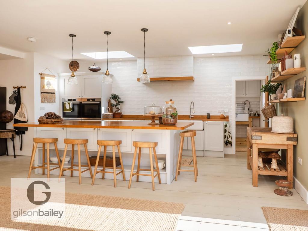 Kitchen fitted with matching matching base and drawer units, built in double eye line oven, induction hob with extractor hood above, integrated appliances including dishwasher and wine fridges, double farm house sink, island, oak work tops, sky lights, large pantry with window to the front, opening into the dining room.