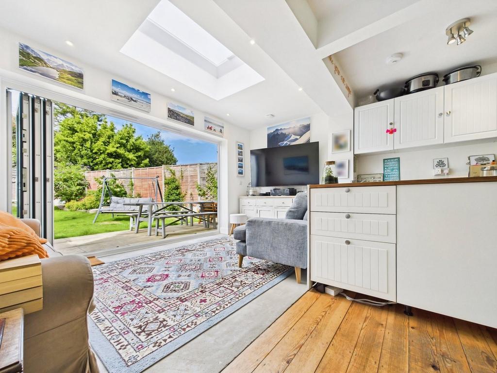 Upon stepping into the property, you are welcomed into the enclosed porch offering space to de boot. The hallway presents a door into the main living area and stairs rising to the first floor with a useful under stairs cupboard. The heart of the home has to be the delightful open plan kitchen/dining/living area running the depth of the property. This room is bathed in natural light and boasts a window to the front elevation, with a skylight window, and bifold doors to the rear providing a seamless transition from indoor to outdoor living. The kitchen area, a lovely social space, comprises a range of wall and base units with a worksurface over. There is a built under electric oven, a two ring gas and two ring electric hob with an extractor above and space for a dishwasher.