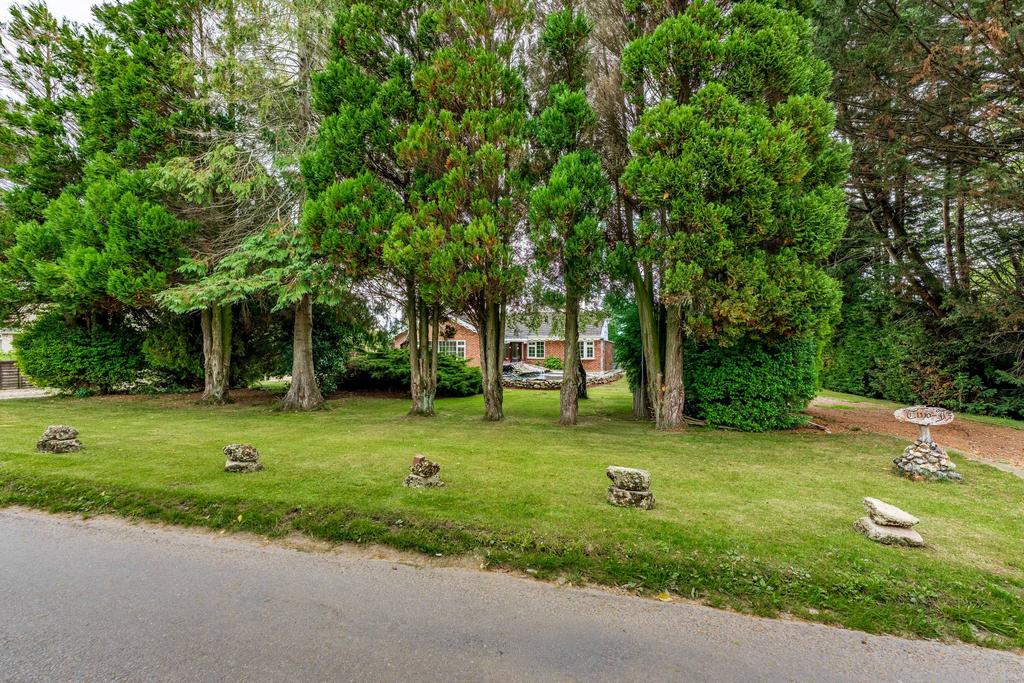 - Front garden featuring an established koi pond and mature tree line providing excellent privacy, with driveway and off-road parking