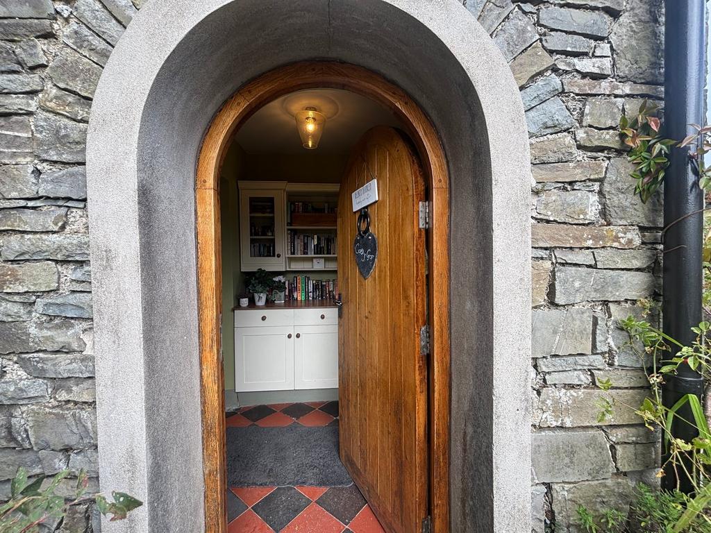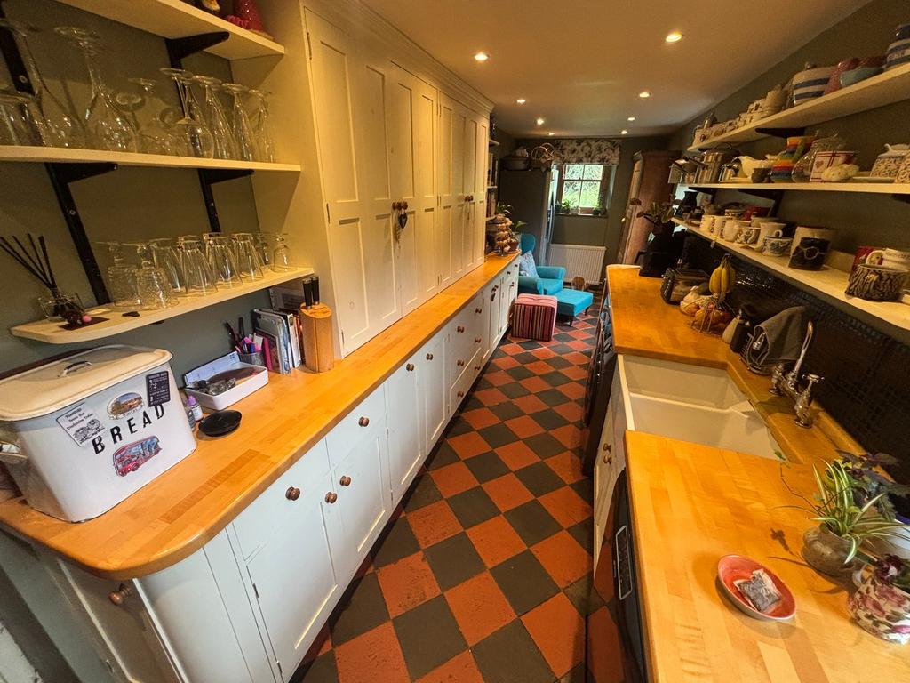 With a Bespoke solid oak entrance door, built-in hand crafted wall and floor cupboards, quarry tiled flooring.