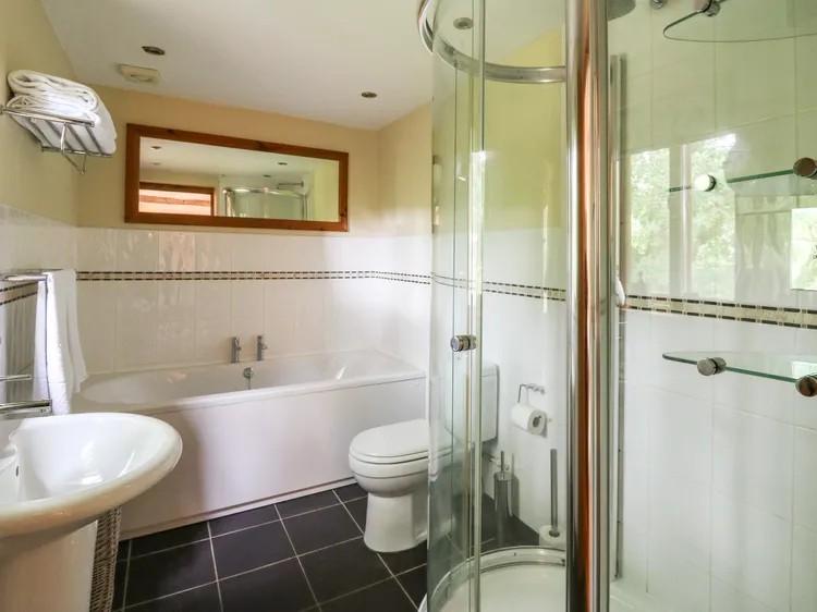 15' 3" x 6' 9" (4.65m x 2.06m). A stylish and contemporary suite comprising of a free standing roll top bath with shower and mixer tap, pedestal wash hand basin with tiled splash back, corner shower cubicle being fully tiled, low level flush w.c., towel heater, radiator.