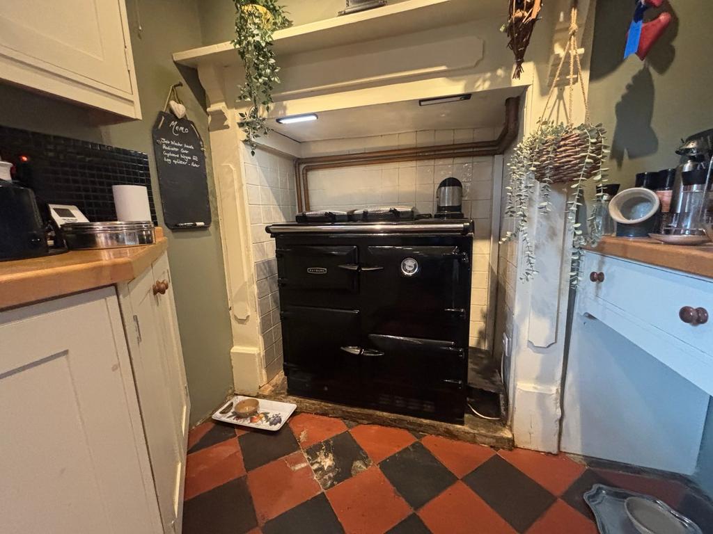 27' 0" x 16' 10" (8.23m x 5.13m). A farmhouse style fitted kitchen with a range of wall and floor units, twin bowl ceramic sink with mixer tap, oil fired Rayburn Range serving the cooking and heating requirements, 4 ring Hotpoint induction hob, integral fridge and freezer, integral Smeg dishwasher, plumbing and space for automatic washing machine, hand crafted stable type rear entrance door, oak box sash windows, ceiling down lighters.