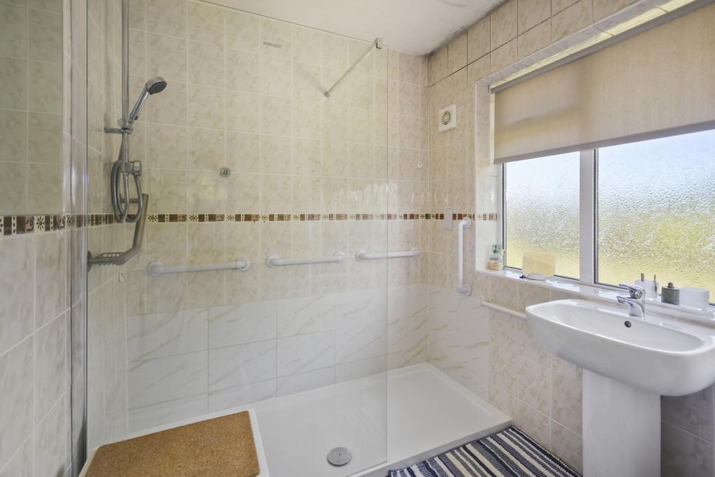En Suite Shower Room: Obscure double glazed window to the rear. Fitted with white suite comprising WC, pedestal hand basin & double walk in shower with glass screen to side. Dimplex wall mounted heater. Tiled walls, inset ceiling lights.