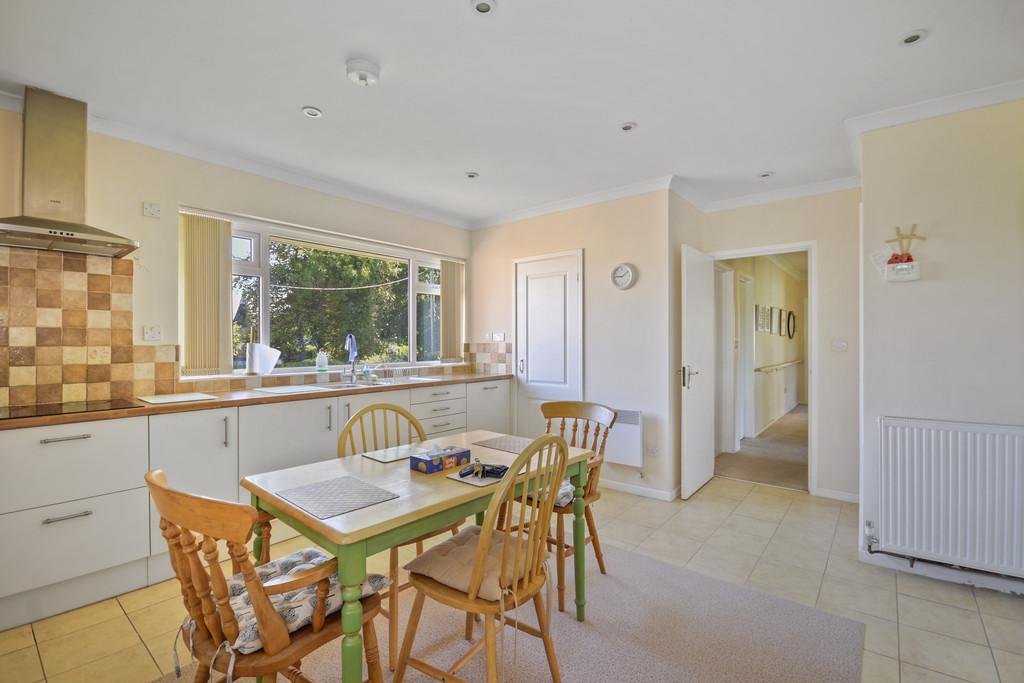 Kitchen/Breakfast Room: Double glazed window enjoying views over the rear garden & part glazed door leading out to the side carport with window alongside. Fitted with range of cream, high gloss base and wall units with roll edge wood effect worktop over, inset with 1 1/2 bowl, single drainer, stainless steel sink unit. Tiled splash-backs. AEG ceramic hob with extractor/light over. AEG double electric ovens with cupboard above and drawers below, integrated Blomberg washing machine. Airing cupboard housing hot water tank with slatted shelves over. Ceramic tiled floor. Space for table. Dimplex heater.