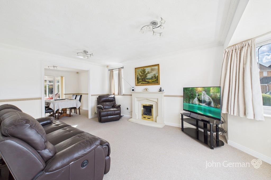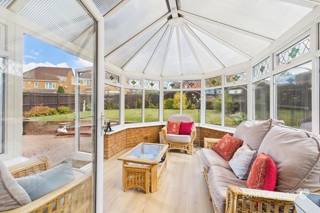 The lounge is a lovely light filled room with a fireplace, a bay window framing open aspect views to front plus an additional side window. A doorway leads through to the dining room that has a conservatory off featuring garden views.