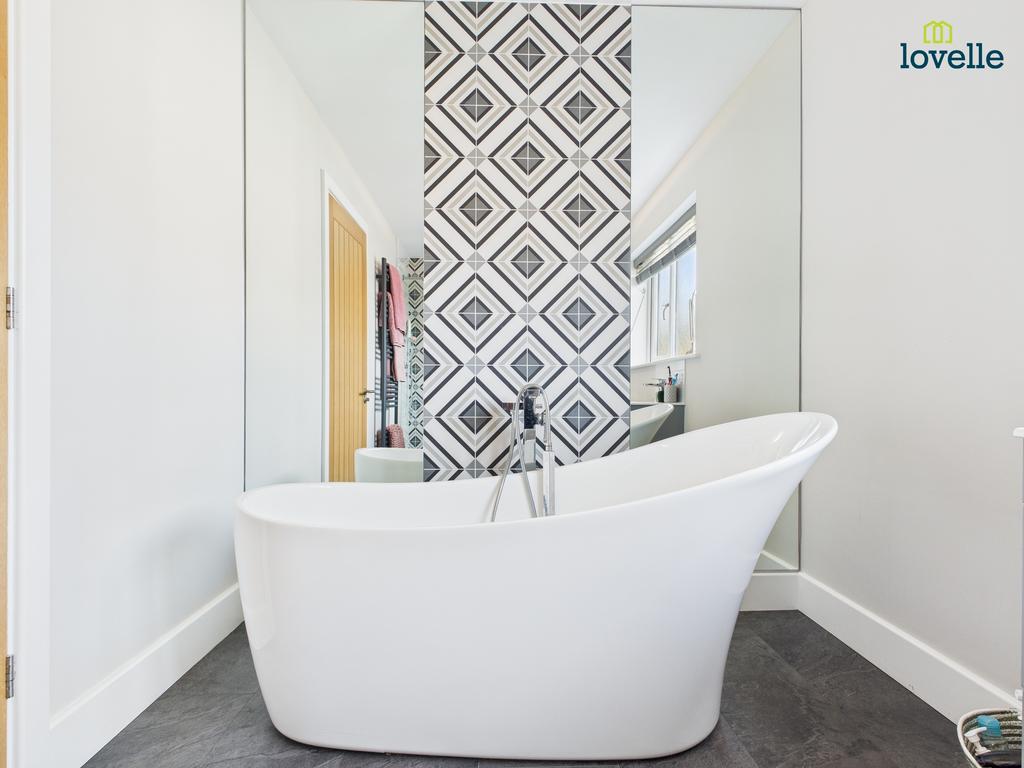 4 piece suite comprising low level WC, vanity hand wash basin, shower cubicle, freestanding bath, karndean flooring, tiled splash backs, heated towel rail and double glazed window to rear aspect