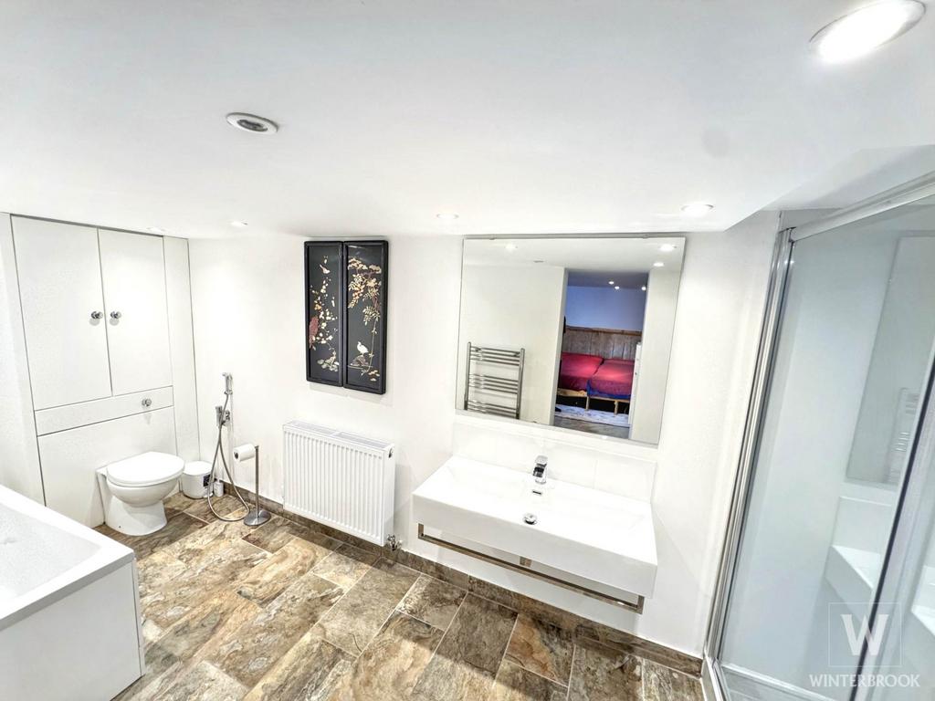 Apartment Two The larger of the two, offering a fitted kitchen, separate living room, a generously sized downstairs bedroom, and a bathroom with both bath and separate shower.