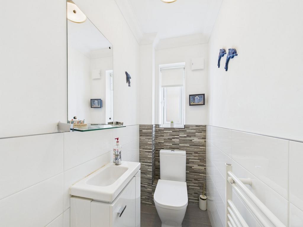 1.61m x 0.95m (5' 3" x 3' 1") There is a frosted double glazed window to the side of the property, low level w.c, ladder style towel radiator, wash hand basin inset to a vanity unit with fitted mirror over, tiled walls to dado level, tiled flooring and an extractor.