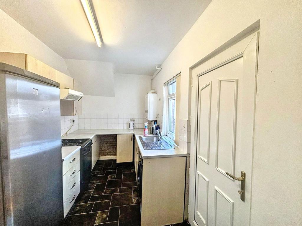 Fitted with rolled-edge worktops, sink with drainer, and space for white goods. Includes a combi boiler, extractor fan, side aspect UPVC double-glazed window, and a UPVC door leading to the rear yard.