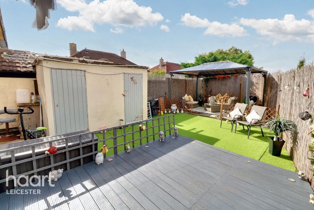 The south-west facing rear garden is low-maintenance and thoughtfully arranged, with a decked seating area and retractable awning just outside the living room, an artificial lawn, and a pergola providing a shaded spot at the far end. Useful outbuildings offer additional storage.