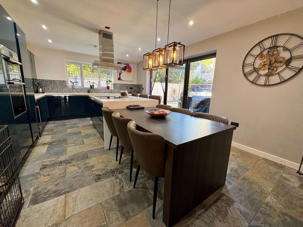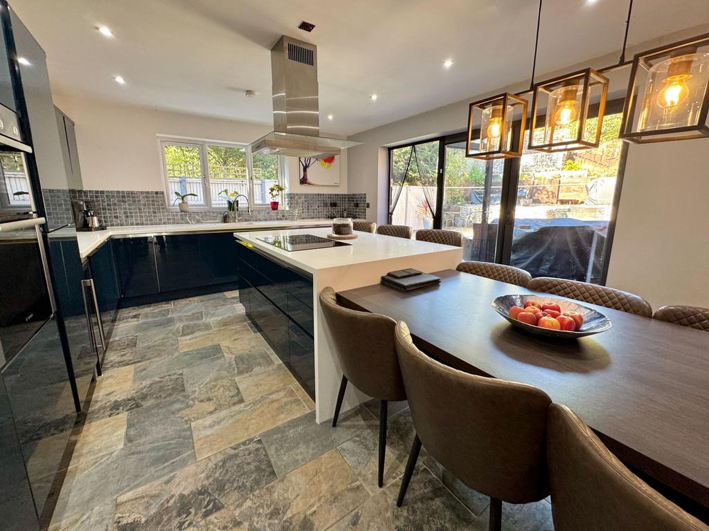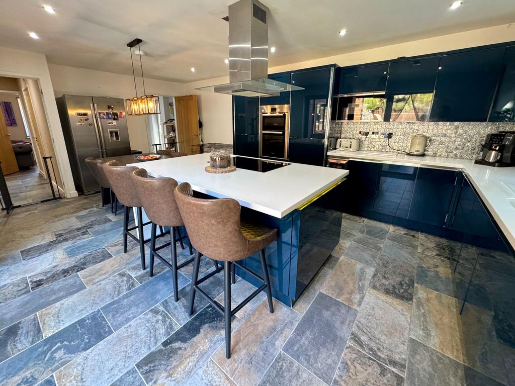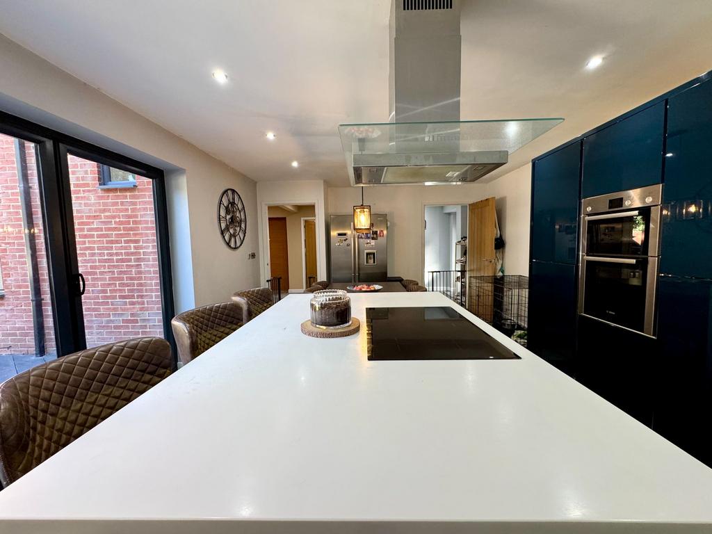 The kitchen has a range of base and eye level wall units with ample worktop space over, tiled splashback and integrated appliances including; double oven, microwave, dishwasher and wine fridge, along with a space for a free standing fridge/ freezer. There is also a feature central island with inset four ring induction hob and ceiling mounted extractor fan above plus a three stool breakfast bar, with further storage cupboards under. The double glazed bifold doors open out to the rear garden, with further double glazed window to rear aspect above the sink and drainer area, underfloor heating and internal door way leading through to utility room.