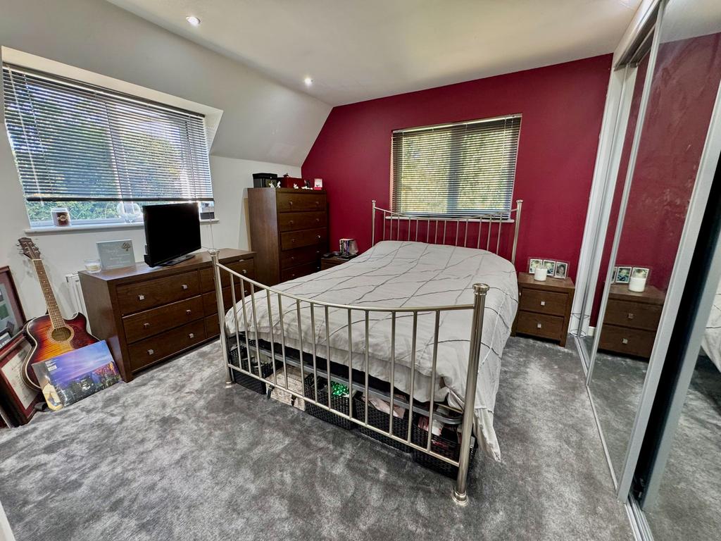 Dual aspect dormer windows with double glazed units to front and rear aspect, built in wardrobe with triple sliding glass doors and wall mounted radiator.
