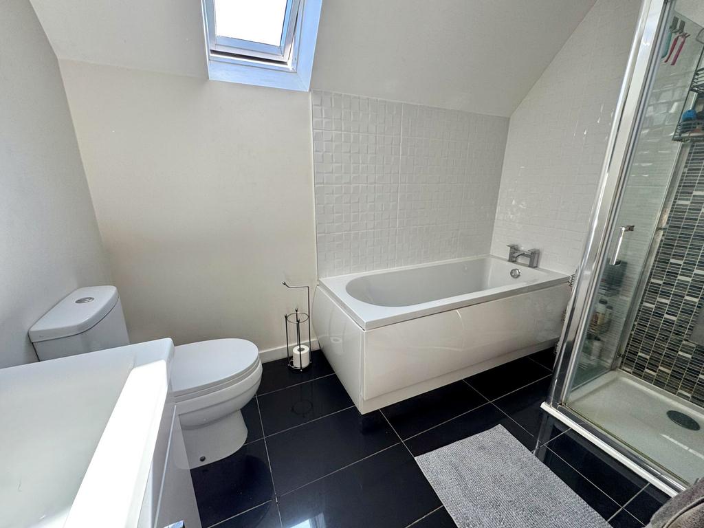 Four piece suite comprising low level wc, wall mounted hand wash basin with vanity storage unit under, panel bath with tiled splashbacks and walk in single shower cubicle with wall mounted shower over and tiled splashbacks. Velux skylight window and wall mounted heated towel radiator.
