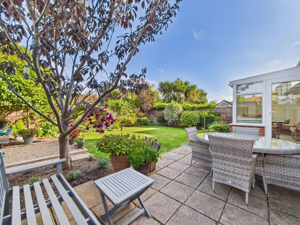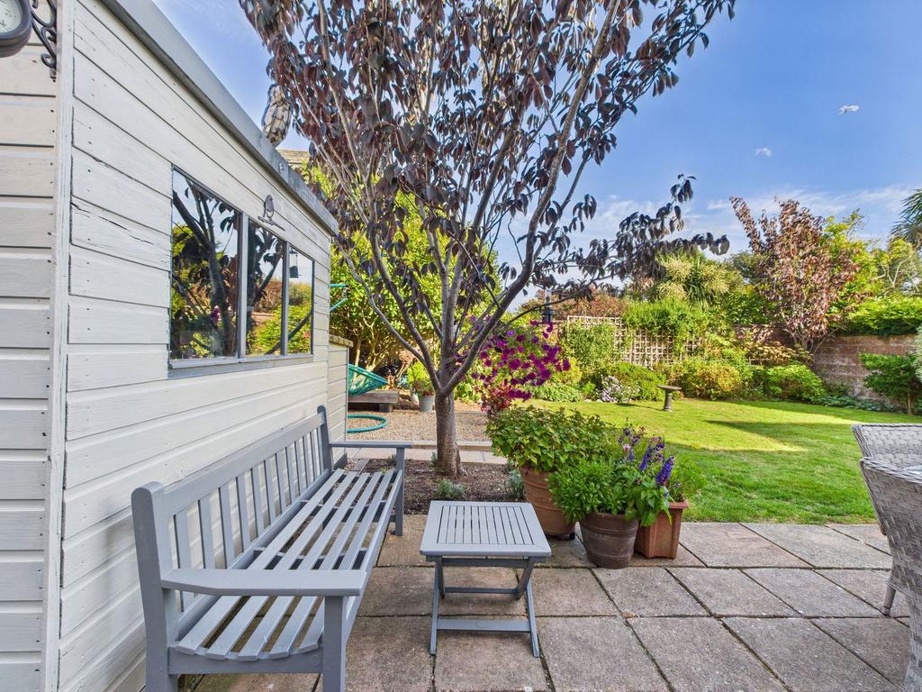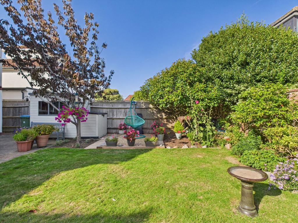 - Mature, enclosed rear garden with lawn, established planting, shed, and side access.