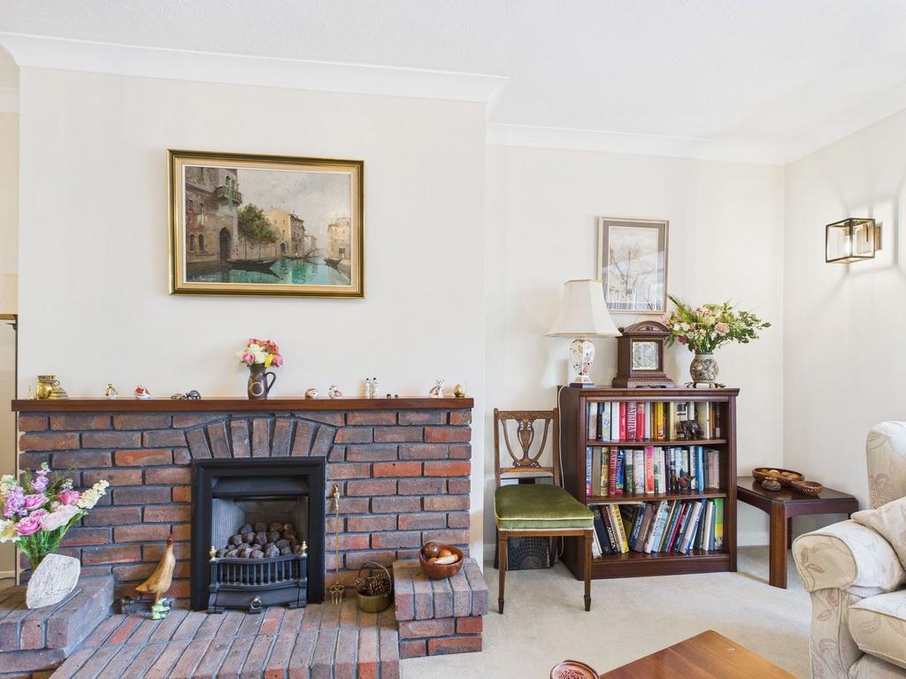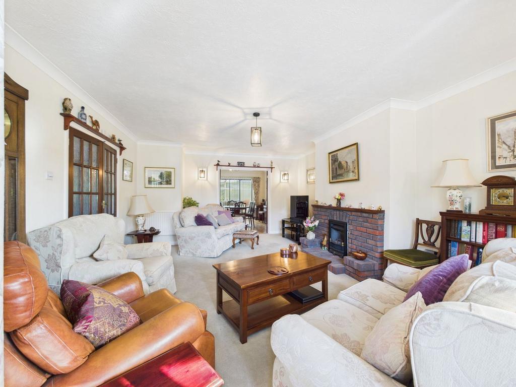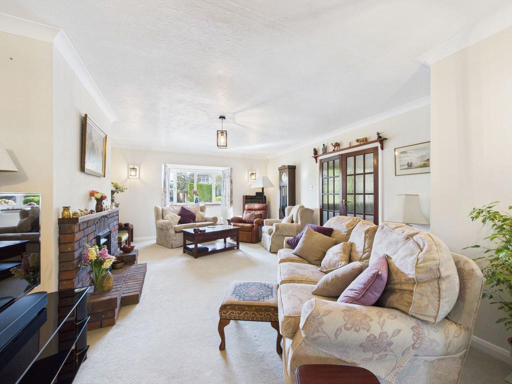 A welcoming hallway introduces the accommodation, leading into a generous living room. Bathed in natural light from its bay window, the space is centred around a feature brick fireplace and exudes a warm, homely atmosphere. Glazed double doors open into the dining room, which in turn leads through to a sunroom overlooking the rear garden — a bright and versatile retreat throughout the seasons.